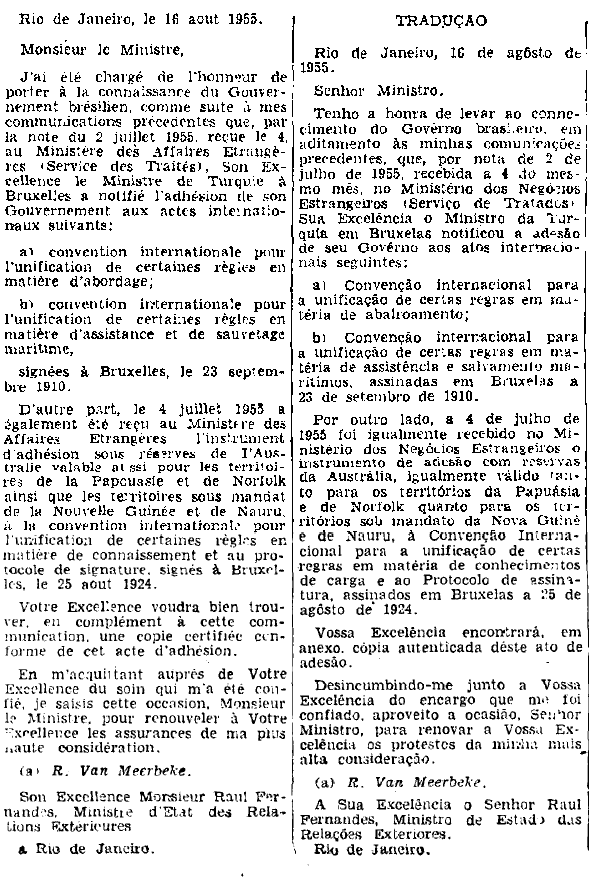 Torna Pública a adesão, por parte do govêrno da Turquia, à Convenção para a unificação de certas regras em matéria de abalroamento e a Convenção para a unificação de certas regras em matéria de assistência e salvamento marítimos, assinadas em Bruxelas a 23 de setembro de 1910.