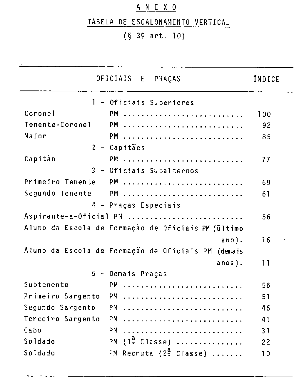 § 3º - O valor do soldo será fixado para cada posto ou graduação, com base no soldo de Coronel PM, observados os índices estabelecidos na Tabela de Escalonamento Vertical, anexa a esta Lei. (Vide Decreto nº 81.192, de 1978) (Vide Decreto nº 81.474, de 1978) (Vide Decreto nº 83.190, de 1979) (Vide Decreto nº 92.464, de 1986)