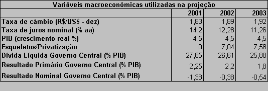 O resultado nominal foi estabelecido a partir das metas de superávit primário e das hipóteses de juros nominais e taxa de câmbio. As projeções para os resultados nominais, por sua vez, apontam para pequenos déficits: 1,38, 0,38 e 0,54% do PIB em 2001, 2002 e 2003, respectivamente. Ao mesmo tempo, a dívida líquida do Governo Central apresenta uma pequena redução no período: de