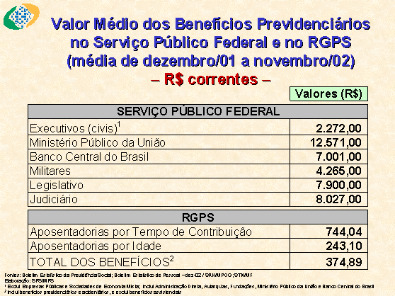 10. Tal situação determina, conforme se verifica na tabela 1, níveis médios de benefícios bastante discrepantes entre diferentes categorias de servidores ou entre essas categorias e os valores médios dos benefícios pagos pelo Regime Geral. Estes valores médios ocultam o fato de que há pessoas percebendo valores de benefícios extremamente elevados, que constituem uma afronta ética e moral em um país com a heterogeneidade social brasileira, no qual para milhões de brasileiros falta até mesmo o alimento básico à mesa diária. Estes benefícios extremamente elevados têm sua origem no fato de que o teto remuneratório geral dos Três Poderes, previsto em texto constitucional, até hoje não foi implementado.