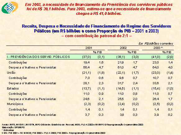 22. Inequívoco, pois, que tais regras colaboram para o grave desequilíbrio financeiro e atuarial existente entre as receitas e as despesas previdenciárias no serviço público nas três esferas de governo. A tabela 2 apresenta dados sobre arrecadação e prestações do regime de previdência dos servidores públicos para os anos de 2001 e 2002 da União, estados e municípios, bem como a estimativa para o ano de 2003, evidenciando uma necessidade de financiamento total da ordem de 39,1 bilhões de reais (3,0% do PIB) em 2002, levando-se em conta a contribuição dos entes públicos. Tais fatos evidenciam a dimensão econômica dos regimes próprios de previdência.