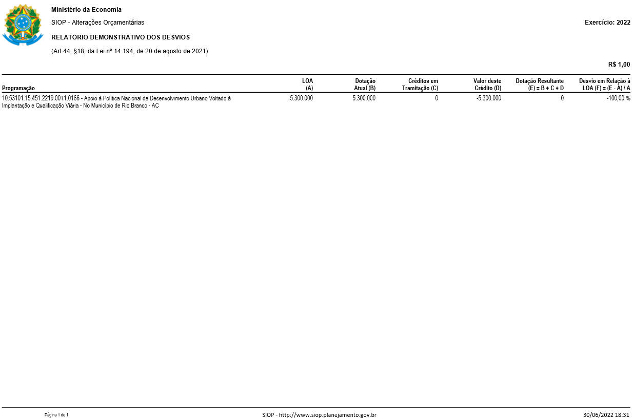 - Ressalte-se, por oportuno, que a alteração em comento decorre de solicitação formalizada por meio do Sistema Integrado de Planejamento e Orçamento – SIOP e, segundo o órgão supracitado, a programação objeto de cancelamento não sofrerá prejuízo na sua execução e está em conformidade com o Ofício nº 058/2022-Sen. Sérgio Petecão, de 20 de maio de 2022, Coordenador da Bancada do Estado do Acre, frisando que o Ministério do Desenvolvimento Regional atestou a observância aos arts. 12, 18 e 20 da LDO-2022, no que couber.