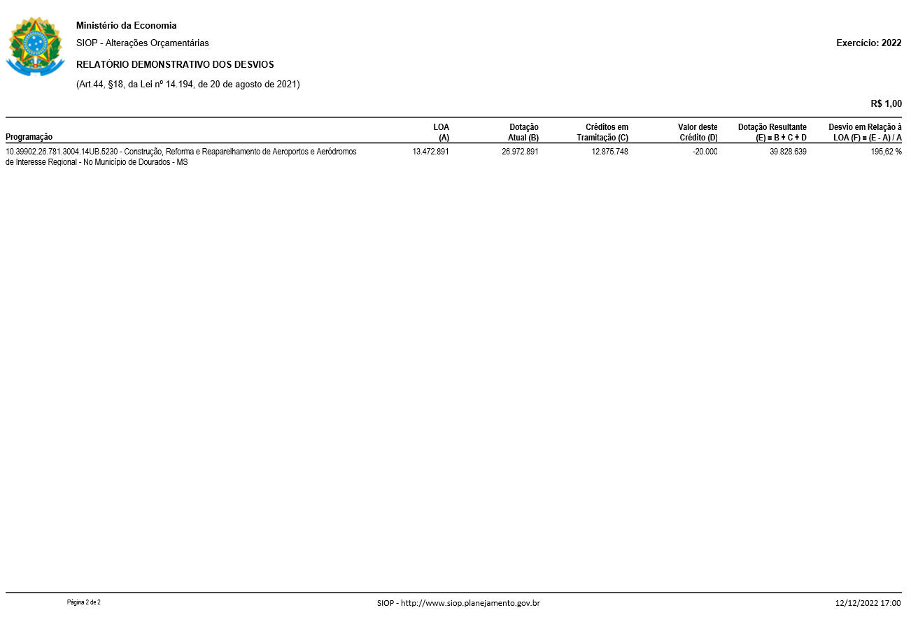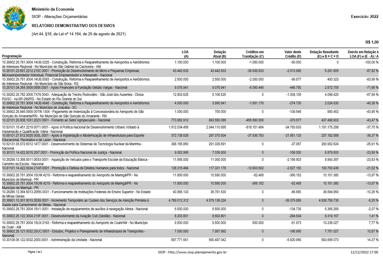 - Em atendimento ao disposto nos §§ 15 e 18 do art. 44 da LDO-2022, seguem, em anexo, o novo demonstrativo de desvios de valores cancelados que ultrapassam vinte por cento da respectiva dotação de cada ação, e do excesso de arrecadação utilizado na mencionada troca de fontes concomitante.