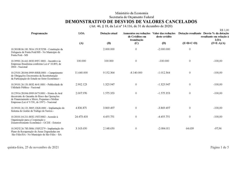 8. Em atendimento ao disposto nos §§ 6º e 18 do art. 46 da LDO-2021, seguem, em anexo, os demonstrativos de superávit referente à troca de fontes concomitante; e de desvios de valores cancelados que ultrapassam vinte por cento da respectiva dotação de cada ação.