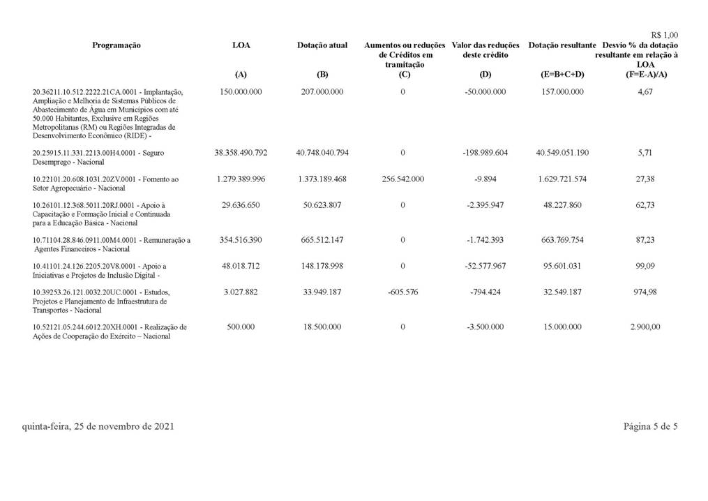 5. No que diz respeito ao art. 107 do Ato das Disposições Constitucionais Transitórias - ADCT, incluído pela Emenda Constitucional nº 95, de 15 de dezembro de 2016, vale frisar que a presente proposta não amplia as dotações orçamentárias sujeitas aos limites das despesas primárias estabelecidos para o ano em curso. Todavia, tendo em vista que parte do cancelamento oferecido se refere a recursos da reserva de contingência relativa a despesas de pessoal e encargos sociais e do Seguro Desemprego, no valor de R$ 502.955.396,00 e R$ 198.989.604,00, respectivamente, os quais já foram considerados na projeção para atendimento do teto de gastos, conforme Tabela 17 do Relatório de Avaliação de Receitas e Despesas Primárias do 5º bimestre, encaminhado por meio da Mensagem nº 605, de 22 de novembro de 2021, será utilizada parcialmente a margem existente de R$ 6.008,8 milhões, conforme os itens 89 e 90 do citado Relatório.