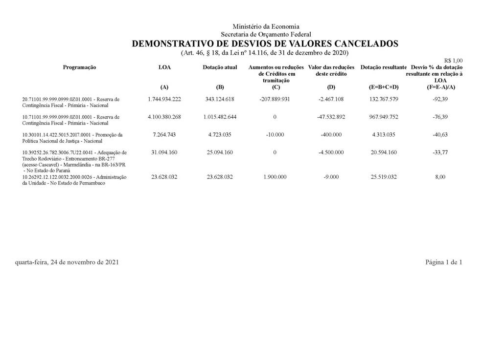 10. Em atendimento ao disposto nos §§ 5º e 18 do art. 46 da LDO-2021, segue, em anexo, os demonstrativos de excesso de arrecadação utilizado no crédito, inclusive em relação à troca de fonte concomitante, e de desvios de valores cancelados que ultrapassam vinte por cento da respectiva dotação de cada ação.