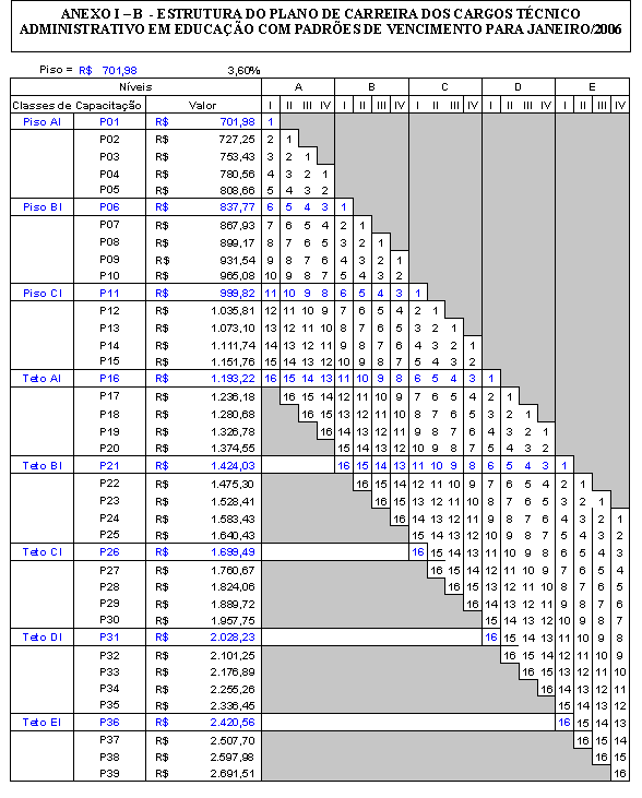 vencimento da carreira em função da classe de capacitação, cargo e nível;