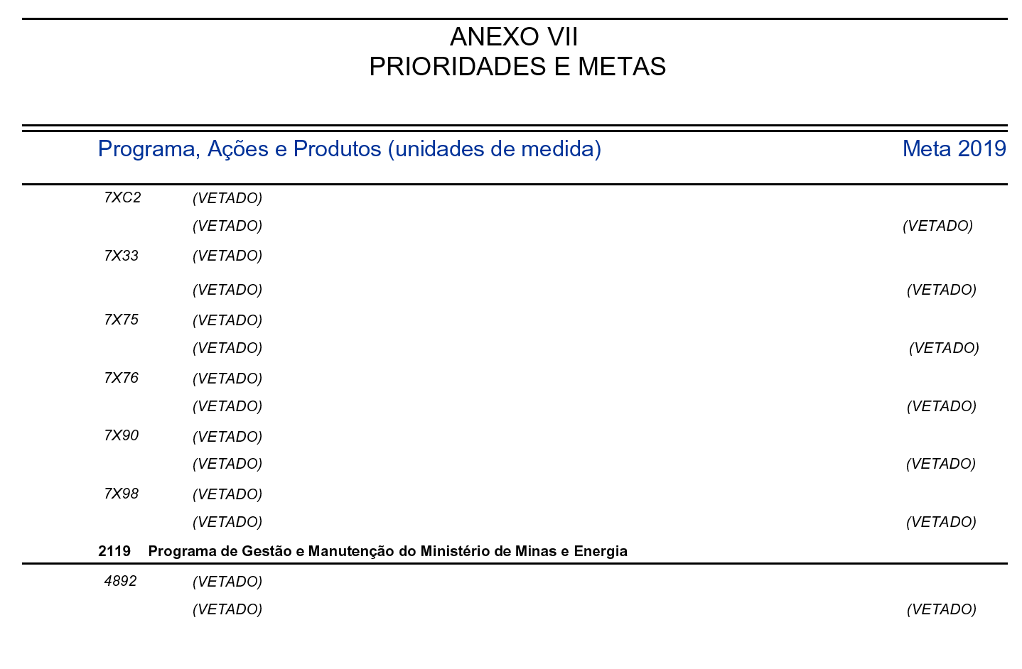 Art. 3º As prioridades e as metas da administração pública federal para o exercício de 2019, atendidas as despesas contidas no Anexo III e as de funcionamento dos órgãos e das entidades que integram os Orçamentos Fiscal e da Seguridade Social, correspondem às programações orçamentárias constantes do Anexo VII .