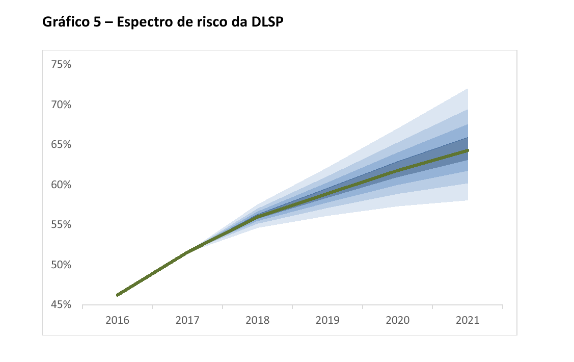 4 – Esta análise tem a fragilidade de subestimar os efeitos do aumento do PIB real por não alterar o resultado fiscal em função deste novo PIB, o mesmo raciocínio vale para a redução do PIB real, que não se reflete em um cenário de fiscal mais deteriorado. Entretanto, a análise é importante por mostrar o quão sensível as projeções de dívida são ao crescimento da economia. Fonte COGEP/STN.