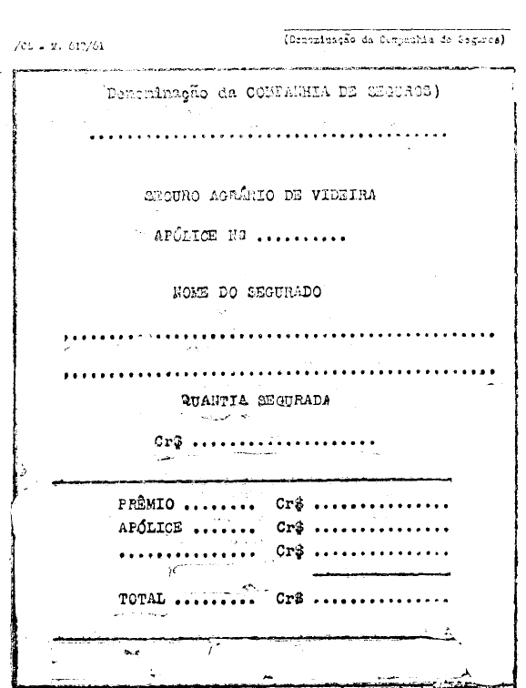 A presente apólice e emitida de conformidade com as declarações da proposta do Segurado e as condições constantes da tarifa do seguro agrário de videira, aprovadas por ato do D. N. S. P. C. e postas em vigor pelo Poder Executivo, as quais são consideradas parte integrante e complementar desta apólice e obrigam o Segurado como se nela estivesse transcritas.