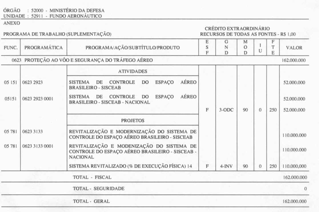 | Conversão da MPv nº 2.057-4, de 2000 | Abre crédito extraordinário em favor do Ministério da Defesa, no Valor de R$ 162.000.000,00, para os fins que especifica. |