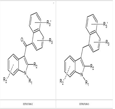 2. Qualquer substância que apresente uma estrutura naftalen-1-il(1H-indol-3-il)metanona (estrutura 2) ou naftalen-1-il(1H-indol-3-il)metano (estrutura 3):