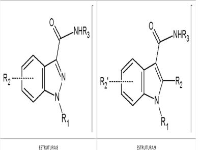 1. Qualquer substância que apresente uma estrutura 1H-indazol-3-carboxamida (estrutura 8) ou 1H-indol-3-carboxamida (estrutura 9):