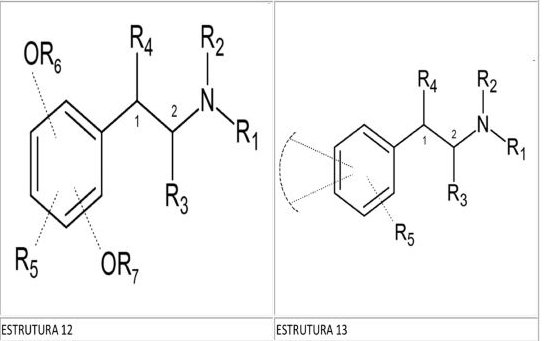 1. Qualquer substância que apresente uma estrutura 1-feniletan-2-amina (estruturas 12 e 13):