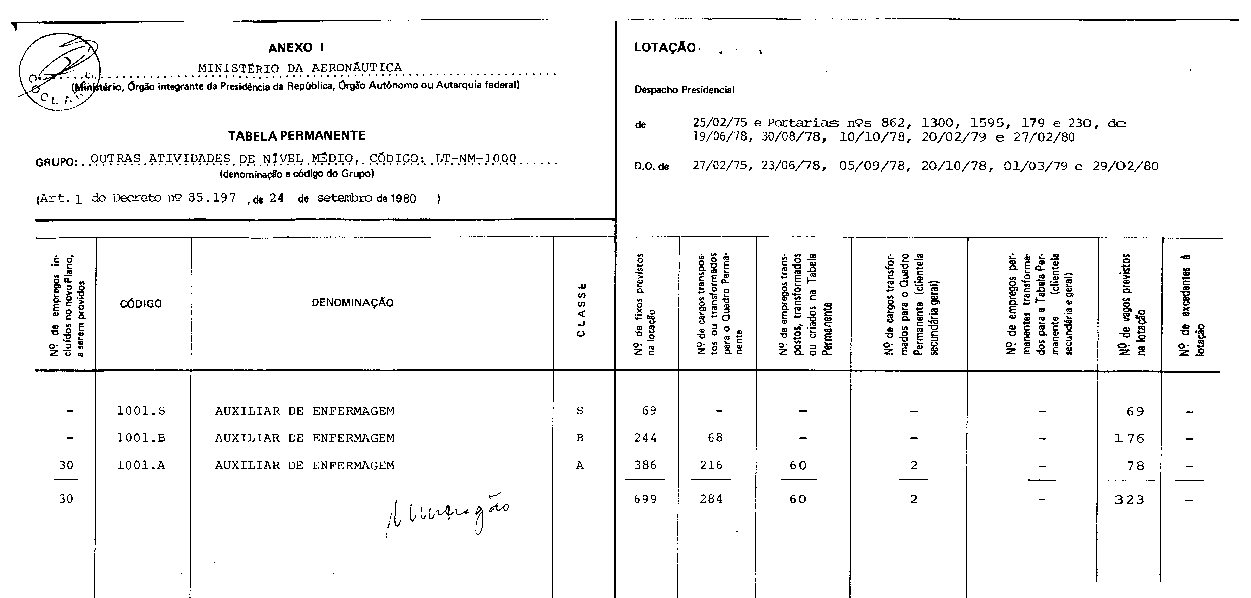 Art . 1º, São incluídos, na forma do Anexo I deste Decreto, na categoria funcional de Auxiliar de Enfermagem, do Grupo Outras Atividades de Nível Médio, código: LT-NM-1000, da Tabela Permanente do Ministério da Aeronáutica, os empregos a serem preenchidos mediante a admissão de candidatos habilitados em concurso público, observada a legislação específica.
