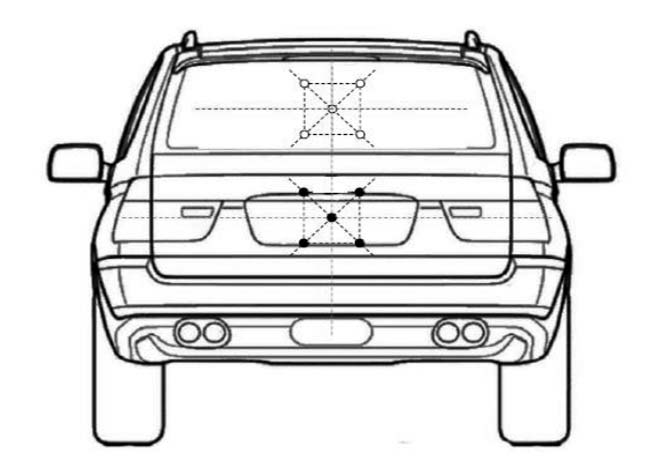 d) Dever ão se realizar dez impactos a 90º, com armas 9mm FMJ ou 44Magnum Lead SWC Gas Checked, nos pontos asinalados nas figuras a seguir.