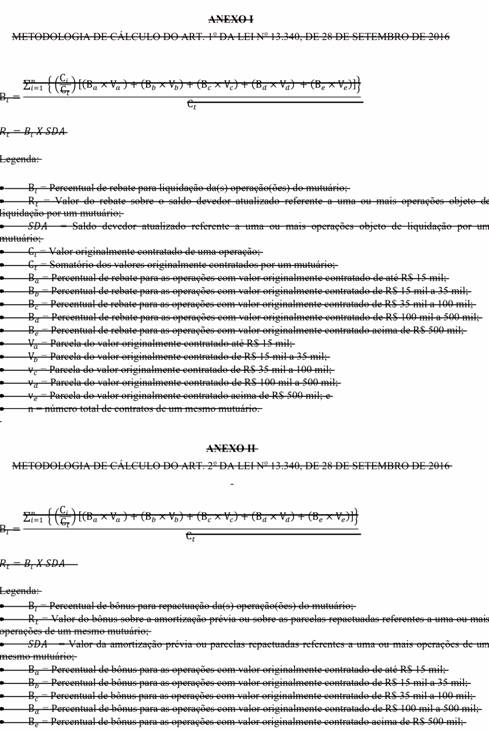 II - o cálculo do percentual de rebate para liquidação ou de bônus para repactuação das operações de cada mutuário será apurado com base no somatório do valor originalmente contratado de todas as suas operações passíveis de enquadramento, independentemente do número de contratos, conforme as metodologias indicadas nos Anexo I , Anexo II e Anexo III ;