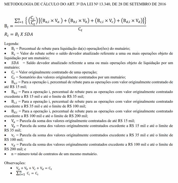 Art. 9º Na concessão de rebate para liquidação das operações de que trata o art. 13 da Lei nº 13.340, de 2016 , além daquelas previstas no art. 1º da referida Lei, serão observadas as seguintes condições: