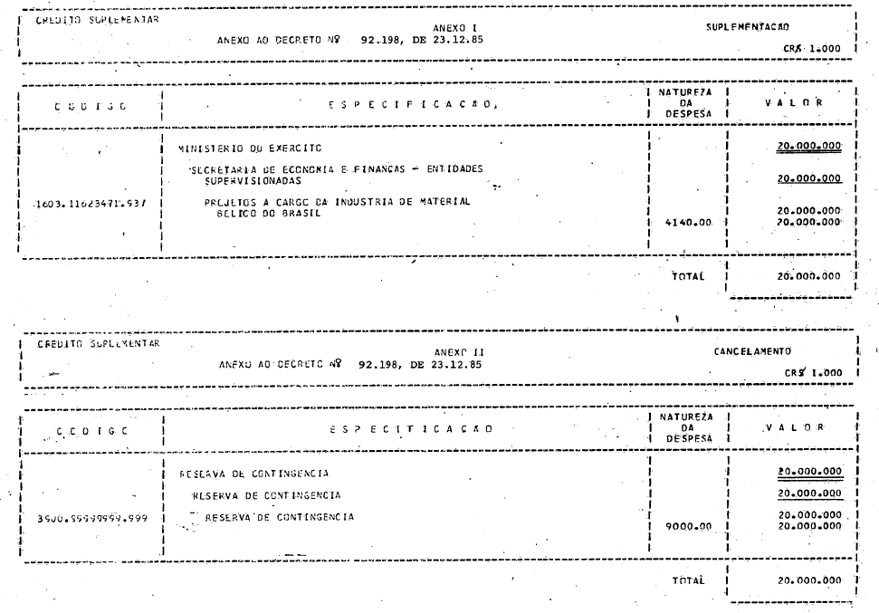 Art.1º - Fica aberto ao Ministério do Exército, em favor da Secretaria de Economia e Finanças - Entidades Supervisionadas, o crédito suplementar no valor de Cr$20.000.000.000 (vinte bilhões de cruzeiros), para reforço da dotação orçamentária indicada no anexo I deste Decreto.