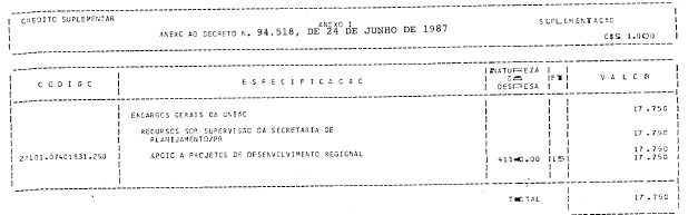 Art. 1° Fica aberto a Encargos Gerais da União - Recursos sob Supervisão da Secretaria de Planejamento/PR o crédito suplementar de CZ$17.750.000,00 (dezessete milhões, setecentos e cinqüenta mil cruzados), para reforço de dotação orçamentária indicada no Anexo I deste Decreto.