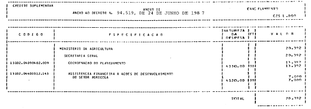 Secretaria-Geral, o crédito suplementar de CZ$ 20.392.000,00 (vinte milhões,