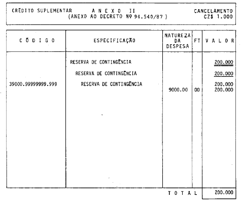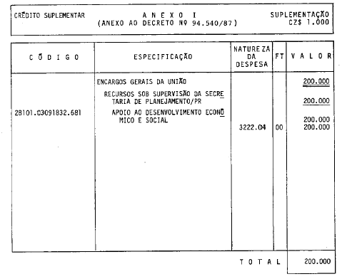 Secretaria de Planejamento/PR o crédito suplementar de CZ$ 200.000.000,00