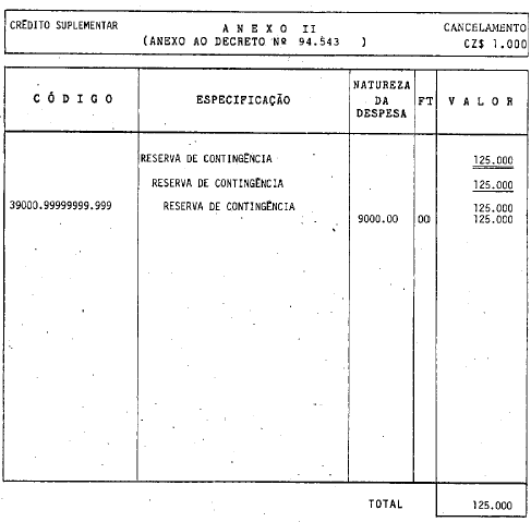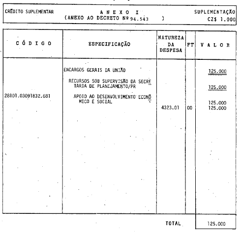 Secretaria de Planejamento/PR o crédito suplementar de CZ$ 125.000.000,00 (cento