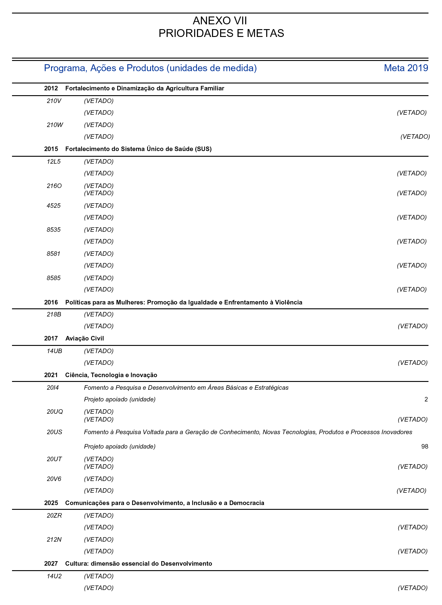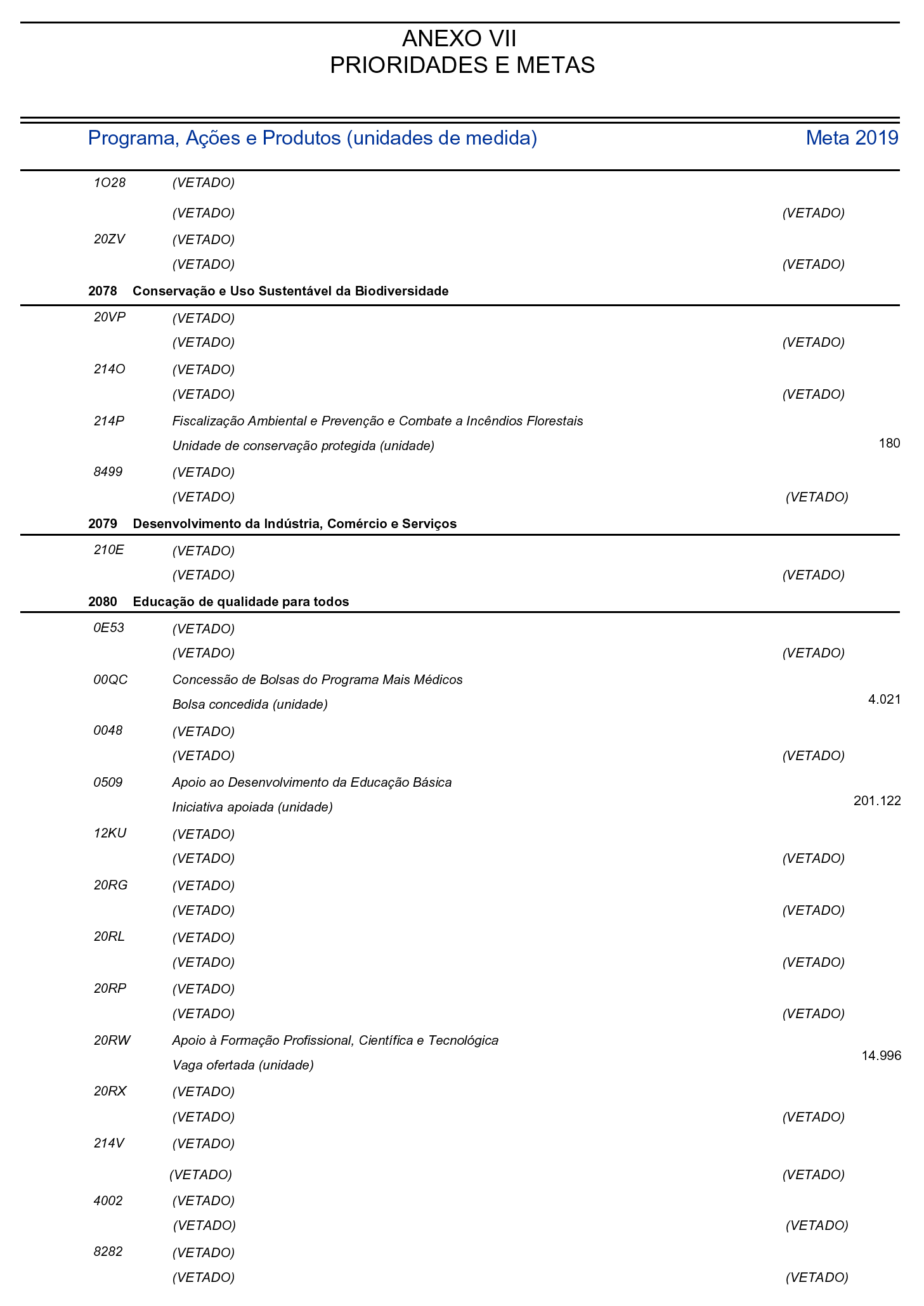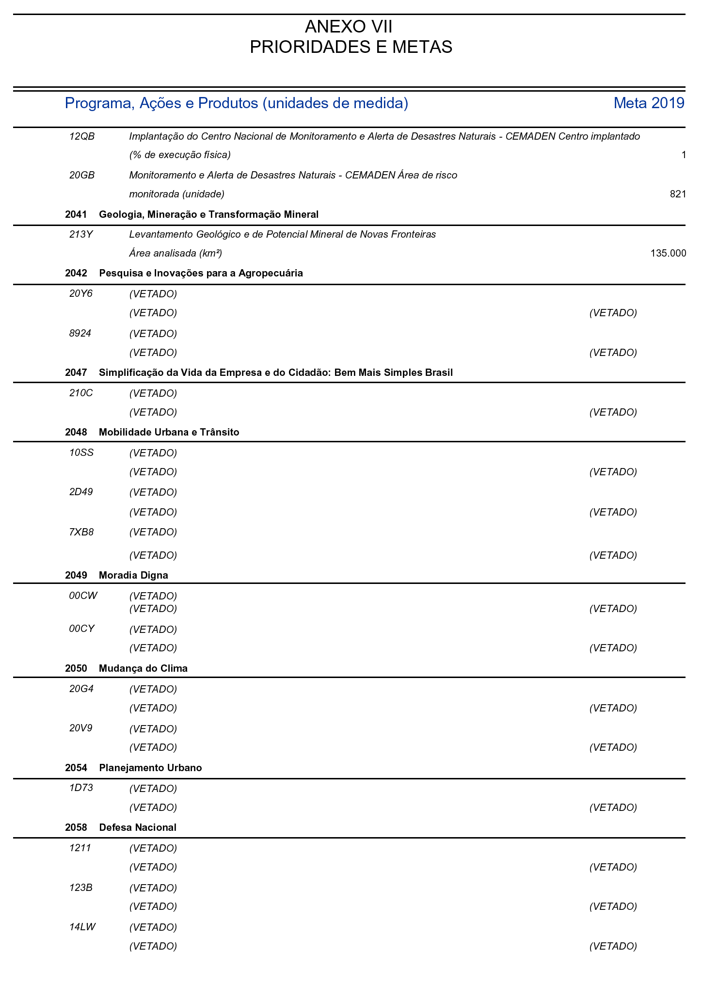 Art. 3º As prioridades e as metas da administração pública federal para o exercício de 2019, atendidas as despesas contidas no Anexo III e as de funcionamento dos órgãos e das entidades que integram os Orçamentos Fiscal e da Seguridade Social, correspondem às programações orçamentárias constantes do Anexo VII .