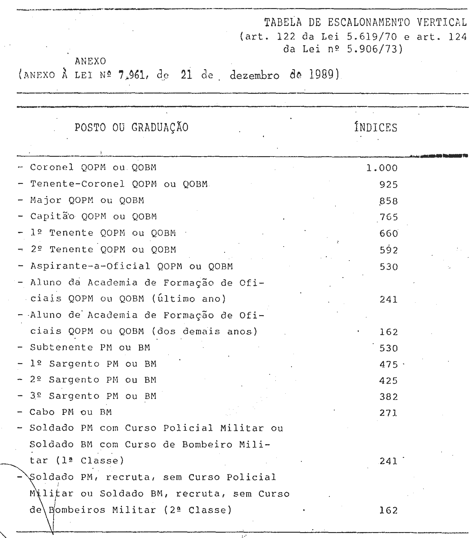 | Conversão da Medida Provisória nº 109, de 1989 | Fixa o valor do soldo dos Postos de Coronel PM da Polícia Militar e Coronel BM do Corpo de Bombeiros do Distrito Federal, e dá outras providências. |