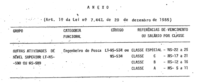 Art. 1º - As classes integrantes da Categoria funcional de Engenheiro de Pesca, incluída no Grupo-Outras Atividades de Nível Superior, designada pelo código LT-NS-534 ou NS-534, de que trata a Lei nº 6.550, de 5 de julho de 1978, correspondem as referências de vencimento ou salário por classe, estabelecidas no Anexo desta Lei.