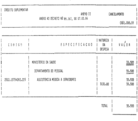 quinhentos mil cruzeiros), para reforço de dotação orçamentária indicada no