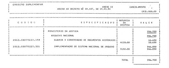 | Revogado pelo Decreto de 15 de fevereiro de 1992 | Abre ao Ministério da Justiça, em favor do Arquivo Nacional, o crédito suplementar no valor de Cr$ 356.700.000,00, para reforço de dotações consignadas no vigente Orçamento. |
