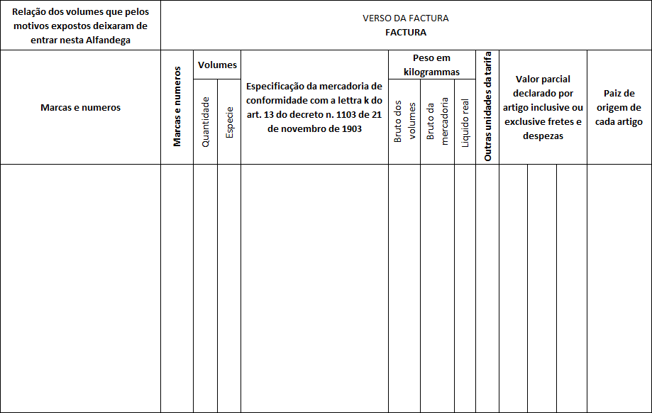 Semelhantemente, quando a mercadoria pagar direitos a peso bruto nos envoltorios designados na tarifa, a factura declarará esse peso na columna respectiva.