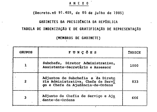 Art . 2º O valor da Indenização e da Gratificação de Representação correspondente à função de Subchefe servirá como base para a fixação dos valores da indenização e da Gratificação das demais funções, observados os índices estabelecidos na Tabela anexa.