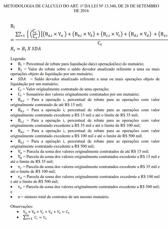 Art. 9º Na concessão de rebate para liquidação das operações de que trata o art. 13 da Lei nº 13.340, de 2016 , além daquelas previstas no art. 1º da referida Lei, serão observadas as seguintes condições: