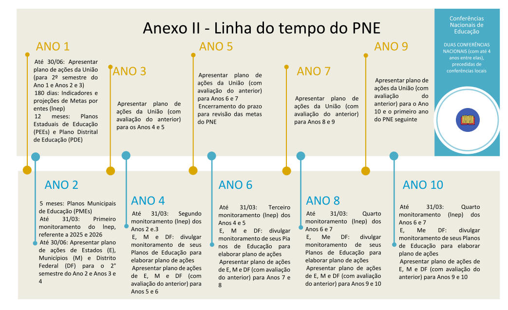 - Monitoramento (Inep), até 31 de março, dos índices dos 2 (dois) exercícios anteriores (art. 11). - Divulgação de informações referentes aos planos de Estados, Distrito Federal e Municípios, para elaborar seus planos de ações (art. 8º). - Avaliação e apresentação de planos de ações de Estados, Distrito Federal e Municípios para os 2 (dois) exercícios seguintes (art. 13). - Envio, até 30 de junho, pelo governo federal, do projeto de lei do plano decenal de educação subsequente, com avaliação e resultados parciais deste PNE, com base em dados do Inep (art. 35). |